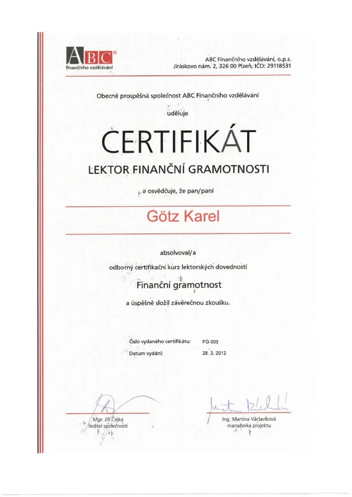 Své práci osobního finančního konzultanta se věnuji více než 25 let. Jejím základním kamenem je podle mě příležitost přinést klientům finance. Ať už je to formou úspory zbytečných výdajů, vytvářením rezerv nebo zabezpečením. Jako vystudovaný právník znám úskalí velkých životních rozhodnutí, jako otec tří dětí se svými klienty sdílím potřebu najít ta nejlepší řešení a poskytnout své rodině jistotu. Jsem lektorem obecně prospěšné společnosti ABC finančního vzdělávání. Kromě realitních a finančních aktivit mám upřímně rád fotografování, cestování, nebo golf a lyžování.