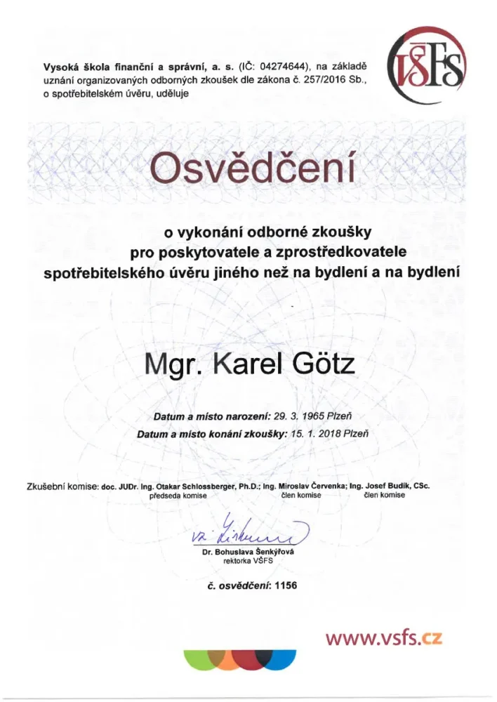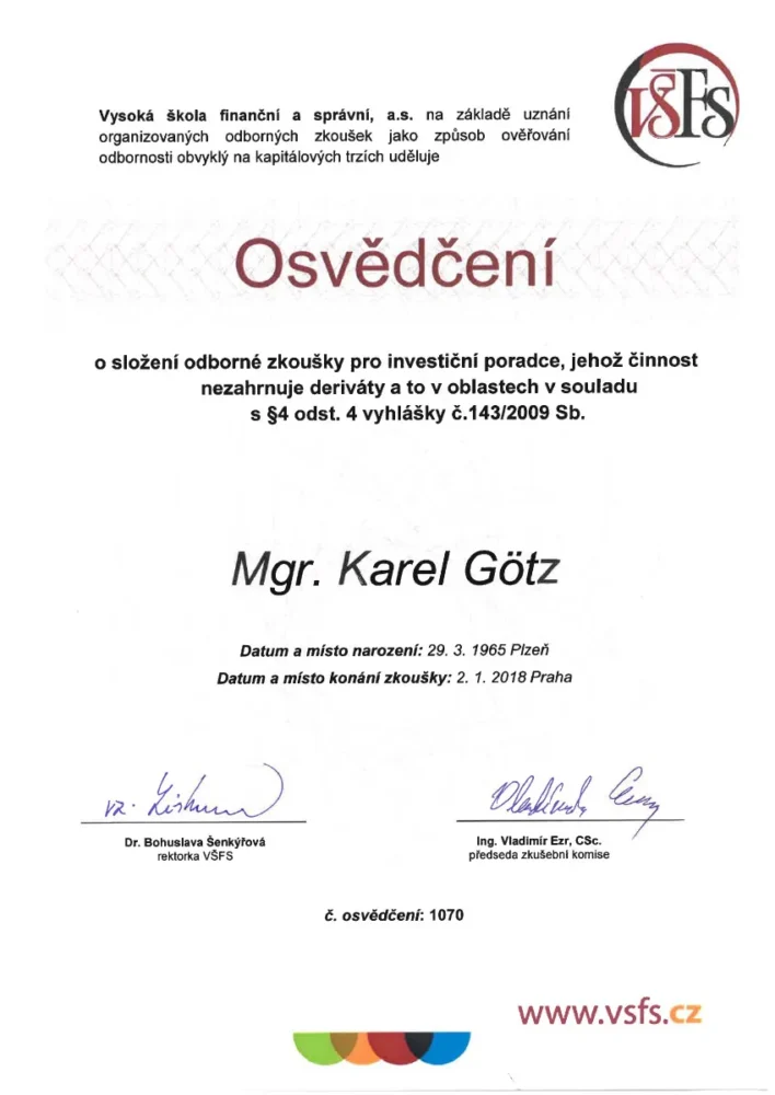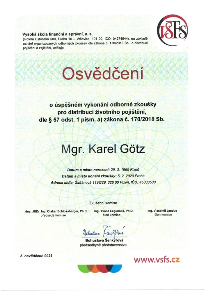 S panem Karlem Götzem spolupracuji již několik let. Spravuje nám pojistky a investice. Vždy je velice vstřícný, snaží se maximálně vyhovět naším požadavkům. Mohu se spolehnout, že vybere optimální variantu řešení dané situace. Seznamuje nás pravidelně o novinkách a dalších možnostech v pojištění a investování. Vždy ochotně odpovídá na dotazy a srozumitelně vysvětluje danou problematiku.